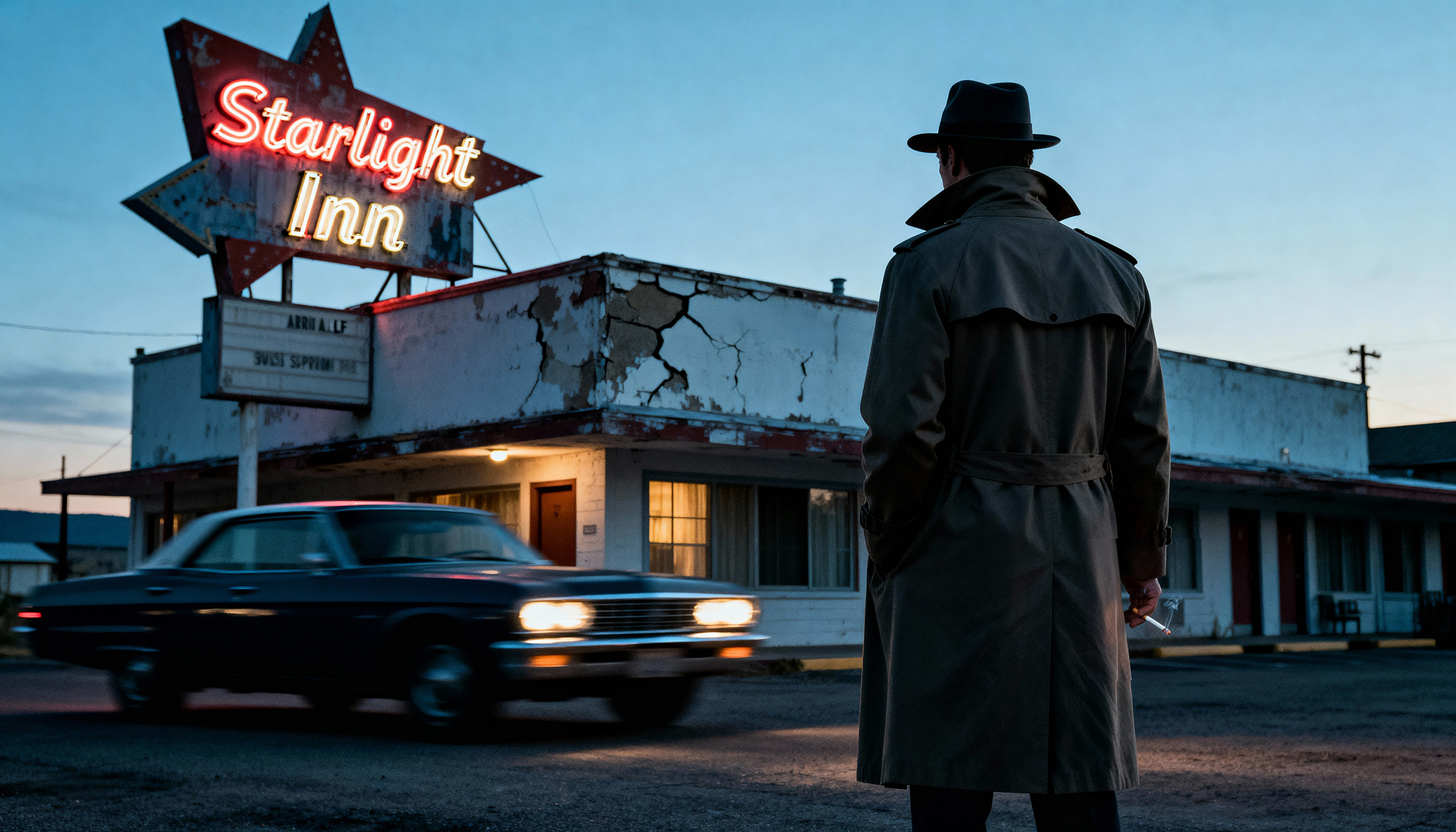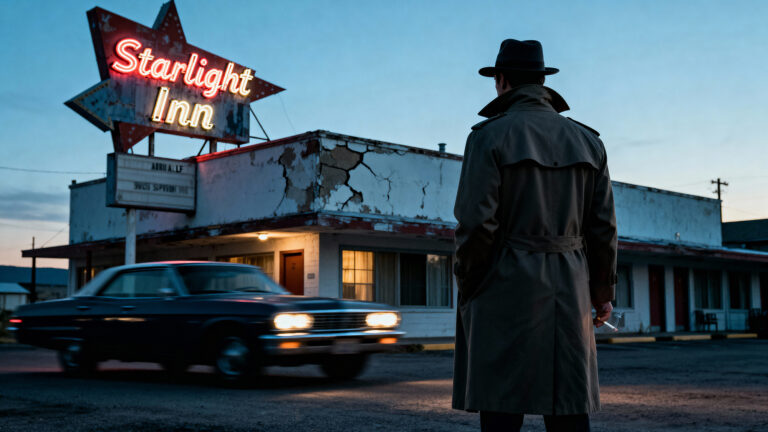 At the edge of a forgotten American town, under flickering neon lights, stands the Starlight Inn — a roadside motel that’s seen too many nights and too few guests. When a detective arrives to investigate reports of strange noises coming from the long-abandoned Room 6, he’s met not with answers, but with silence, cigarette smoke, and the lingering sense that someone — or something — is waiting. The bored night receptionist gives him the key with a smirk and a warning disguised as a joke. Inside, the detective finds nothing unusual: a clean bed, still air, a wardrobe standing quietly by the wall. But as he opens it, reality begins to shift. In the faint glow of his Zippo lighter, the hanging coats look strangely familiar — identical to his own. Then, from the darkness between them, something reaches out. What follows is a brief, violent struggle in near-total darkness — a collision of identity and imitation. The next thing we see is movement: a figure emerging from the wardrobe wearing the detective’s clothes and his face, but not his eyes. Room 6 is a three-minute AI-generated short horror film that blends noir atmosphere with psychological dread. It explores repetition, transformation, and the eerie fragility of self — a story about what happens when you confront the part of you that isn’t you anymore.